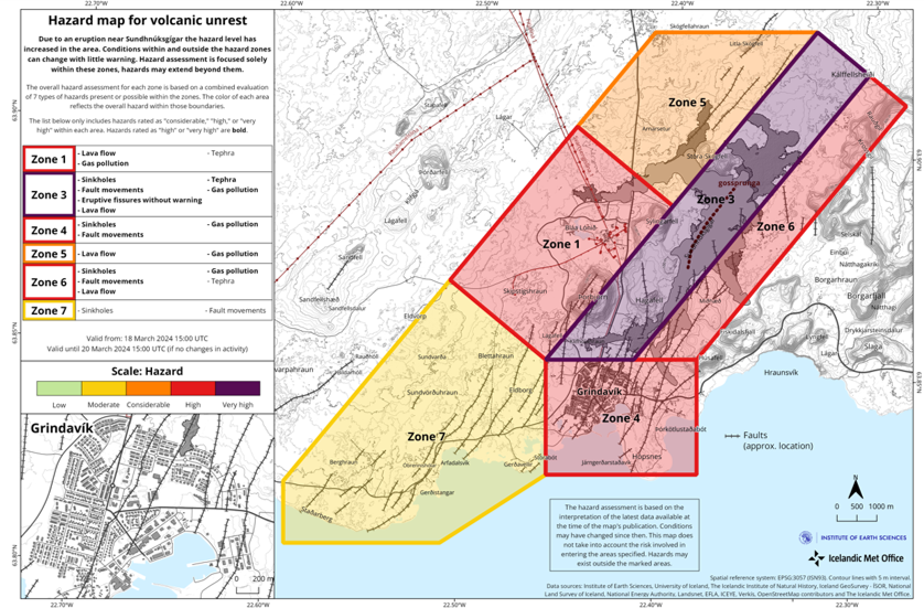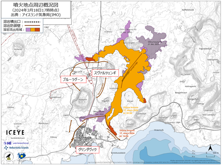 現時点(3月19日午後4時)においては噴火活動は小康状態にありますが、溶岩の流出は継続しているうえ、火山性ガス(硫黄)の発生も観測されていますので、アイスランド政府等の発表を注視し、何らかの指示がある場合にはこれに従って行動してください。